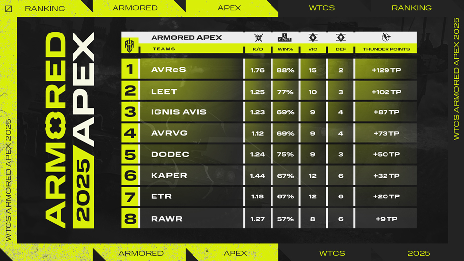 Last Sunday marked the end of the Armored Apex 4x4 Tournament, the [url=https://steamcommunity.com/games/236390/announcements/detail/547863072022204105]second major event of the WTCS season[/url]. After advancing from the qualifiers, AVReS delivered an outstanding performance in [url=https://steamcommunity.com/games/236390/announcements/detail/547864982714319352]the play-offs[/url], remaining undefeated and securing a 3-0 victory against LEET in a thrilling Sinai final. With this win, AVReS now tops [url=https://warthunder.com/en/text/wtcsleaderboard]the WTCS leaderboard[/url] with 256 points!