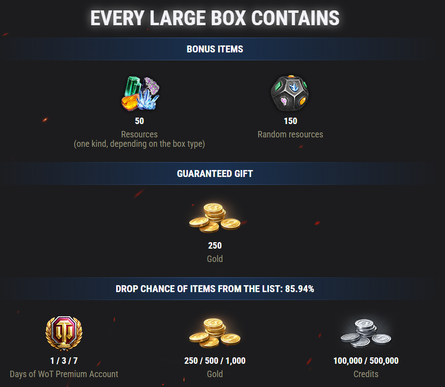 All Large Boxes will always guarantee [b]250 gold as a default gift[/b]. As a bonus with each Large Box, you will also get [b]150 random Holiday Ops resources[/b], plus [b]50 additional resources[/b]—which one depends on the Box’s type. [quote=]There’s no way you can lose out—all the goods you get are worth more than the box![/quote] [table equalcells=1] [tr] [th]BOX TYPE[/th] [th]RESOURCE[/th] [/tr] [tr] [td]New Year[/td] [td]Rock Crystal[/td] [/tr] [tr] [td]Christmas[/td] [td]Pure Emerald[/td] [/tr] [tr] [td]Lunar[/td] [td]Warm Amber[/td] [/tr] [tr] [td]Magic[/td] [td]Meteoric Iron[/td] [/tr] [/table] [i]Rock Crystal and Pure Emerald are used to increase the Festive Atmosphere Level, while Warm Amber and Meteoric Iron are needed to complete Assignments From Vinnie and Redshire Cat’s Assignments.[/i]