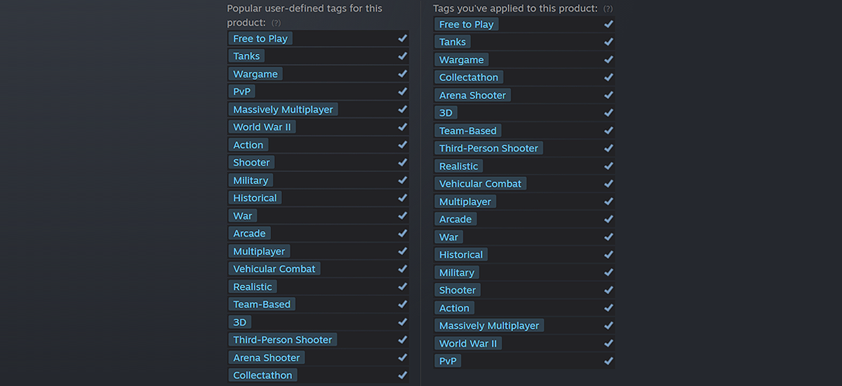 Let us and your fellow players know by [url=https://store.steampowered.com/app/1407200/World_of_Tanks/?tags=&snr=1_2108_9__2107][b]adding tags you think are a good fit[/b][/url] for World of Tanks. As a thank you for your support, we’ll give you [b]two Community Tokens[/b] that you can use to claim various rewards in-game!