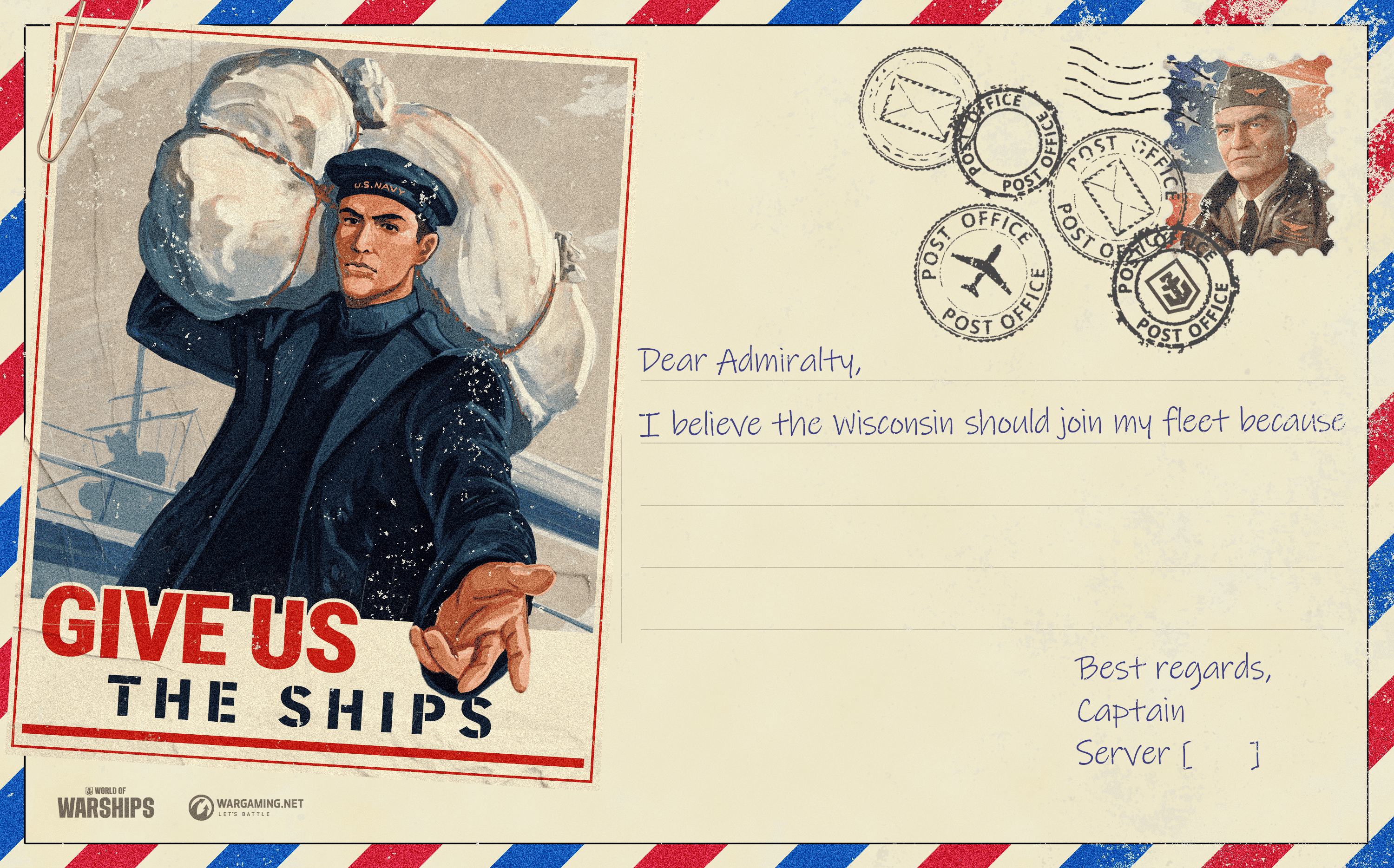[i] "Dear Admiralty, I believe the Wisconsin should join my fleet because......... ." Nickname/Server. [/i]