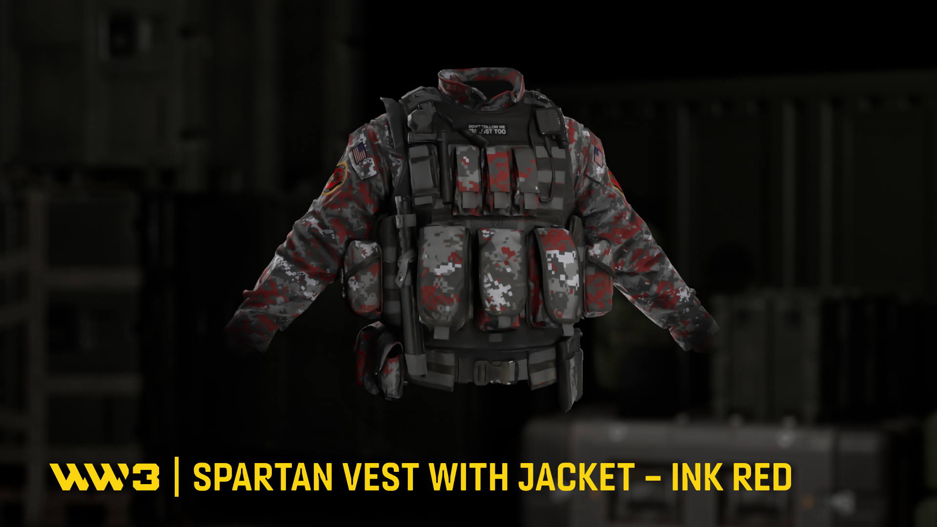 Tactical vest equipped with multiple pockets and cargo slots. Combined with a long sweatshirt in an unusual red-gray-black camouflage pattern.