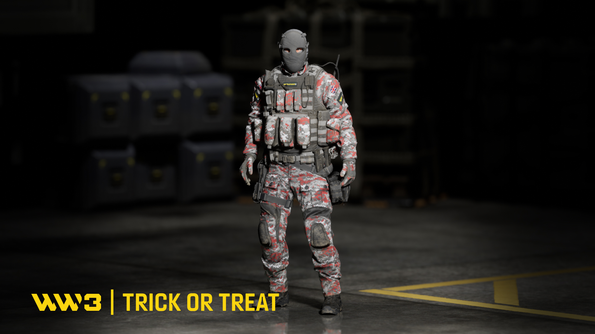 [b]Operator Trick or Treat[/b] - Operator in an unusual black and gray camouflage with red accents. It is characterized by a full outfit, through which not even a piece of bare skin shines through. The whole is crowned with a black ballistic face shield. You don't want to meet him at night as an opponent.