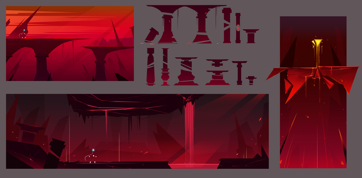 For the environments we knew we wanted to represent each area by different colours and shapes, something that was a bit abstract but felt familiar and pleasantly atmospheric.