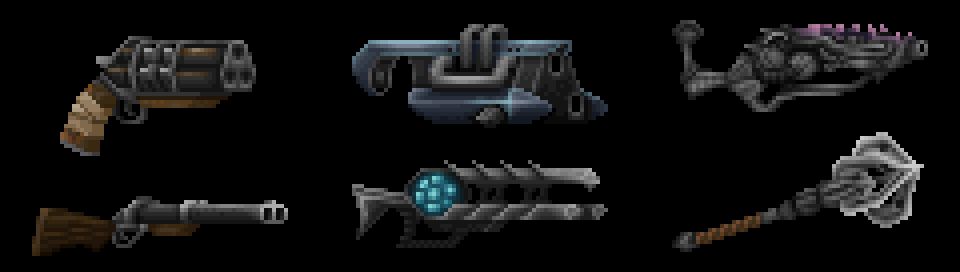 We’ve been adding more pickup icons. First are the Relics that the Outlander collects at the end of each level and deposits into the Relic Circles shown above. The next image shows some of the in-progress weapon pickup icons.