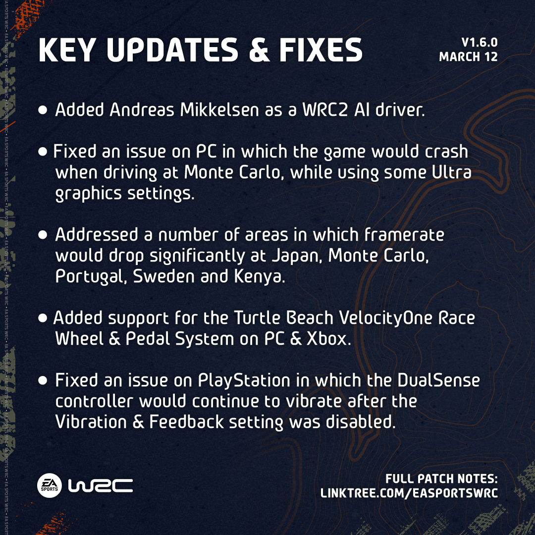 The latest update for EA SPORTS™ WRC is available to download from March 12, 11:00 UTC, and includes several improvements and bug fixes across many areas of the game.