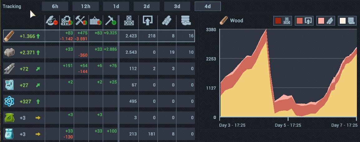 - New screen to analyze your economy, check your [b]tracked resources[/b] and [b]graphs [/b]showing how much was produced and consumed by workers and various machines, helping you to foresee shortages.