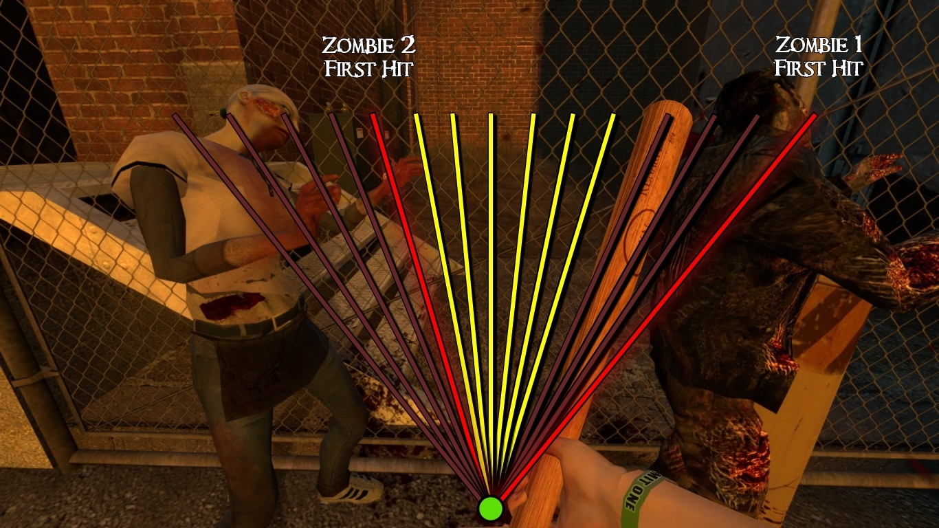 We've implemented an interesting feature for our melee weapons called "hit rays" to improve their attack range and accuracy, making combat against multiple targets more viable. Each swing will create an arc of line tracers in the player's FOV according to the melee weapon's range. You won't be able to 360° swing hit.