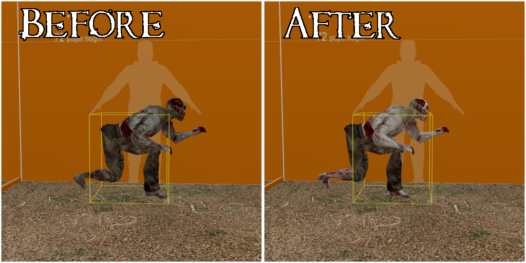 As many of you already know, there is an issue with the players hitboxes when crouching that can make it very difficult to hit the crouching players head. The issue is that the hitbox for the head is sticking outside of the bounding box, which means your hits will not register on that part of the hitbox that is outside of the bounding box. We attempted to fix this in several ways, but these adjustments caused the side effect of getting stuck in objects when crouch jumping. So unfortunately we had to revert those changes, and we will look into how we can properly fix the crouching hitboxes in the future. There is another fix we did for this that we will be including in the update, and that was moving the origin of the crouching animation backwards. This makes it so that the front of the head hitbox fits a little better into the bounding box. A side effect of this change is that now there is part of the leg hitboxes sticking out the back of the bounding box, which of course means you won't be able to hit those parts of a crouching Zombie. We thought this was a good compromise in order to be able to hit the head hitbox easier, though. [url=https://clan.akamai.steamstatic.com/images/562405/c04b4100163b639626a2723b9c82de1e7a87acce.jpg]