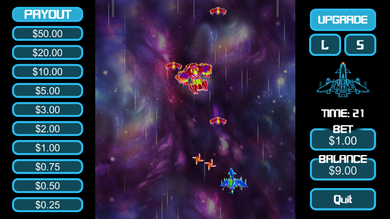 Ever wonder what baby a slot machine and a classic shooter would make? Well wonder no more! Cosmic Cash combines the retro action packed feel of arcade shooters with the thrill of winning big at the slots. The game is simple, place a bet, play a level, try and make millions! It is possible, we the team have done it! Use your new found riches to upgrade your ship helping you get through waves of unreasonably evil space bad guys with glamorous ease. But remember you could lose it all in one foolish bet like I usually do. Cosmic Cash is meant to be a quick pick up and play game to enjoy at any time. How theoretically rich will you get? Go get em space bounty hunter person!
