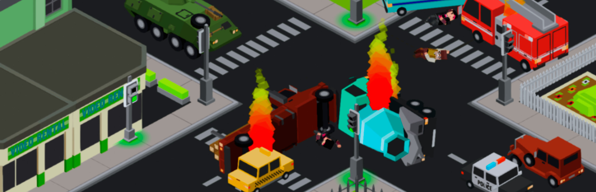 Cartoon graphics but the real situation with impatient drivers and pedestrians. Which driver will crossing first? You decide!