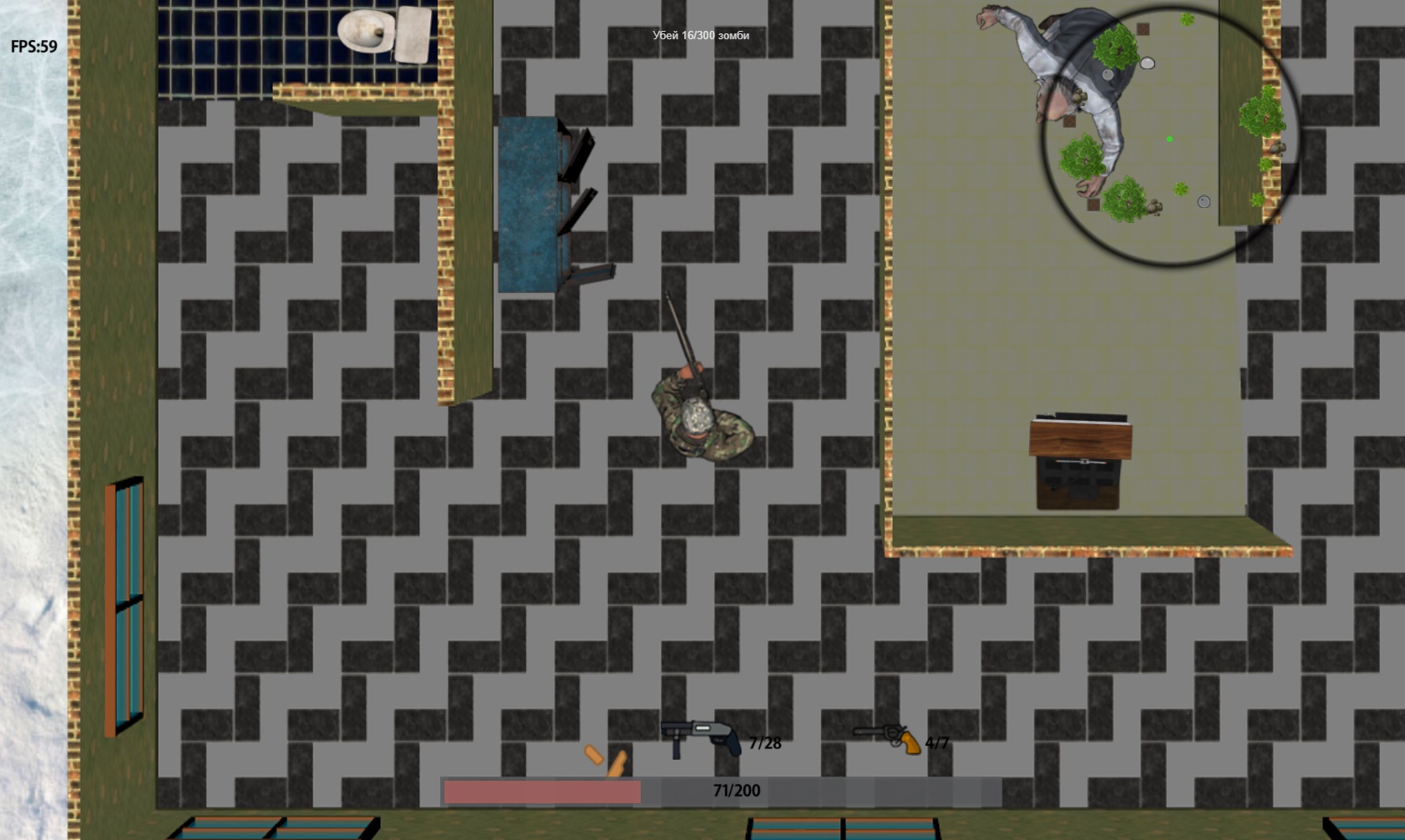 Controls: WASD-walking, [1]/[2] ]/[3] ]/[4] - change weapons.
