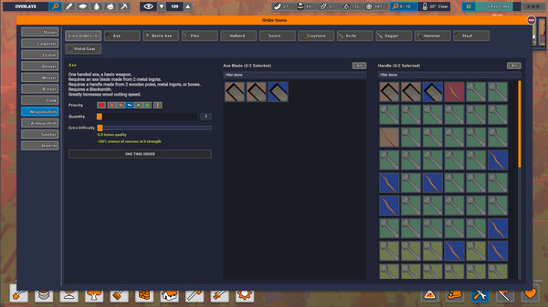 Gather a large variety of materials and craft items with a deep hierarchical crafting item system. With practice comes the ability to build better items, smith more effective weapons and armours, and smelt better ores. Each part of an item affects its effectiveness in different ways. A spear could be made with an iron head and wooden shaft, or it could have a steel head and bronze shaft.