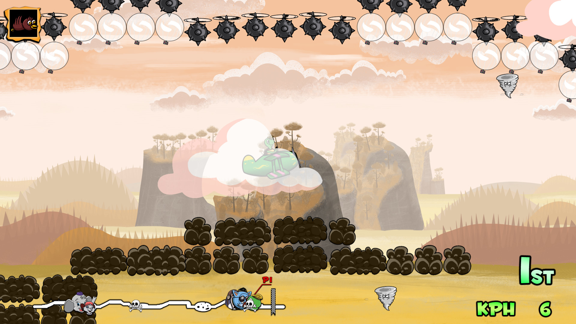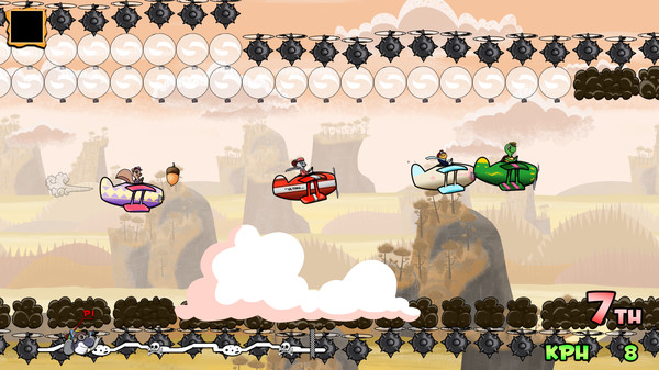 You can race in Grand-Prix mode against the other characters (CPU) in solo or split-screen two players. Grab power ups in special balloons to use them to get advantages in the race. Along speed boosts or throwing birds out, each character has their own special power-up.