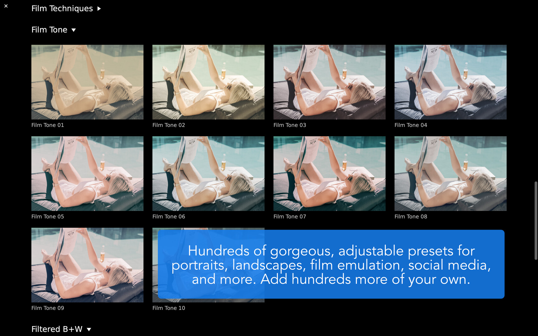 - Easily apply and adjust hundreds of filter presets, plus make and share your own