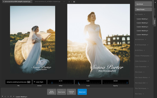 - Tons of useful presets for wedding photography, portraits, landscapes, film emulation, and more