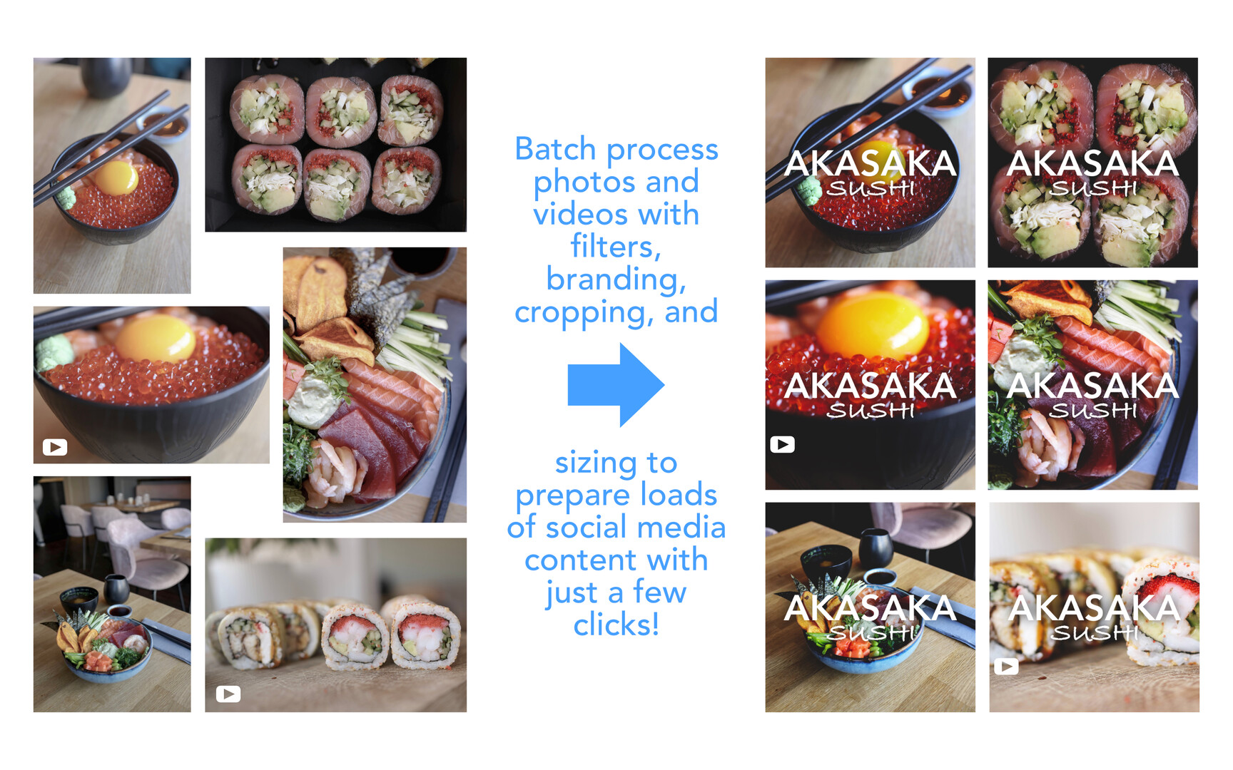- Easy batch filtering (including watermarking/branding, text overlays, and resizing/cropping)