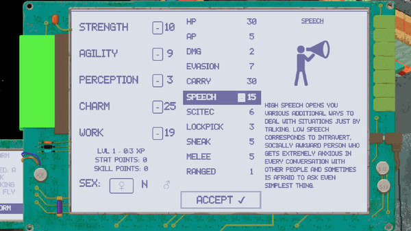 This is the most important part of the game - you can play whatever character you wish, play however you want to. You can be smooth talker, sneaky hacker or brawling bully; or something else - it's your choice: distribute the points in character creation and make decisions when playing.But once the character has been created, be ready for not only abilities but also limitations.