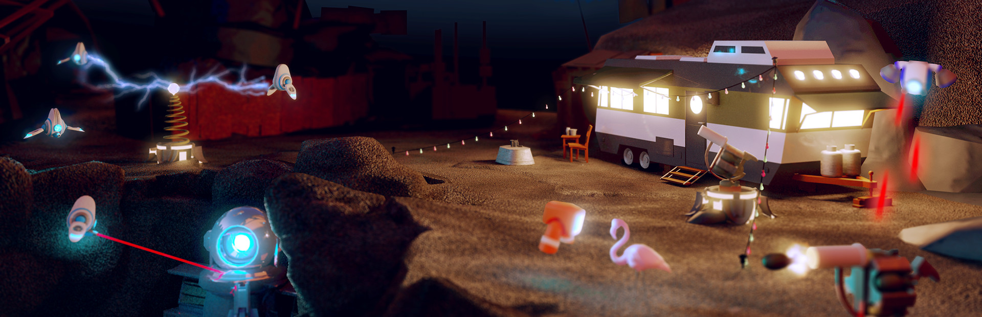 ?It?s just me and my Scrappy in this old junkyard, scrappin? and buildin? all the day long. He?s grown from a tiny sprocket to a full grown machine and I couldn?t be happier. But those propellerheads at DroneCorp don?t like it one bit, a monopoly on artificial smarts is what they got. Now they?re comin? to dismantle the lil feller, but i just can?t let em? do that. With Scrappy buildin? weapons and traps, all I gotta do is shoot em?. I can blast a gnat off a squirrel?s butt from 100 feet away, so I reckon a couple of big old drones will be no fuss at all.?Home A Drone is a Tower Defense-inspired VR FPS, where you use skill and strategy to defeat the DroneCorp menace who threatens to take away what you love. Use carefully placed traps, and a pile of quirky, scrapped together weapons to shoot down those pesky drones, and collect their scrap to build more weapons.