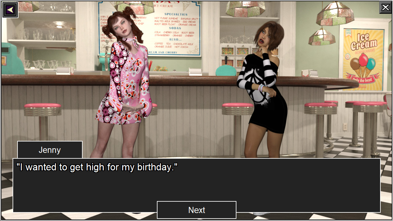 Play as an adult human woman who is tagging along with her friend, Jenny. It's Jenny's twenty-third birthday and she wants to find a way to celebrate it.