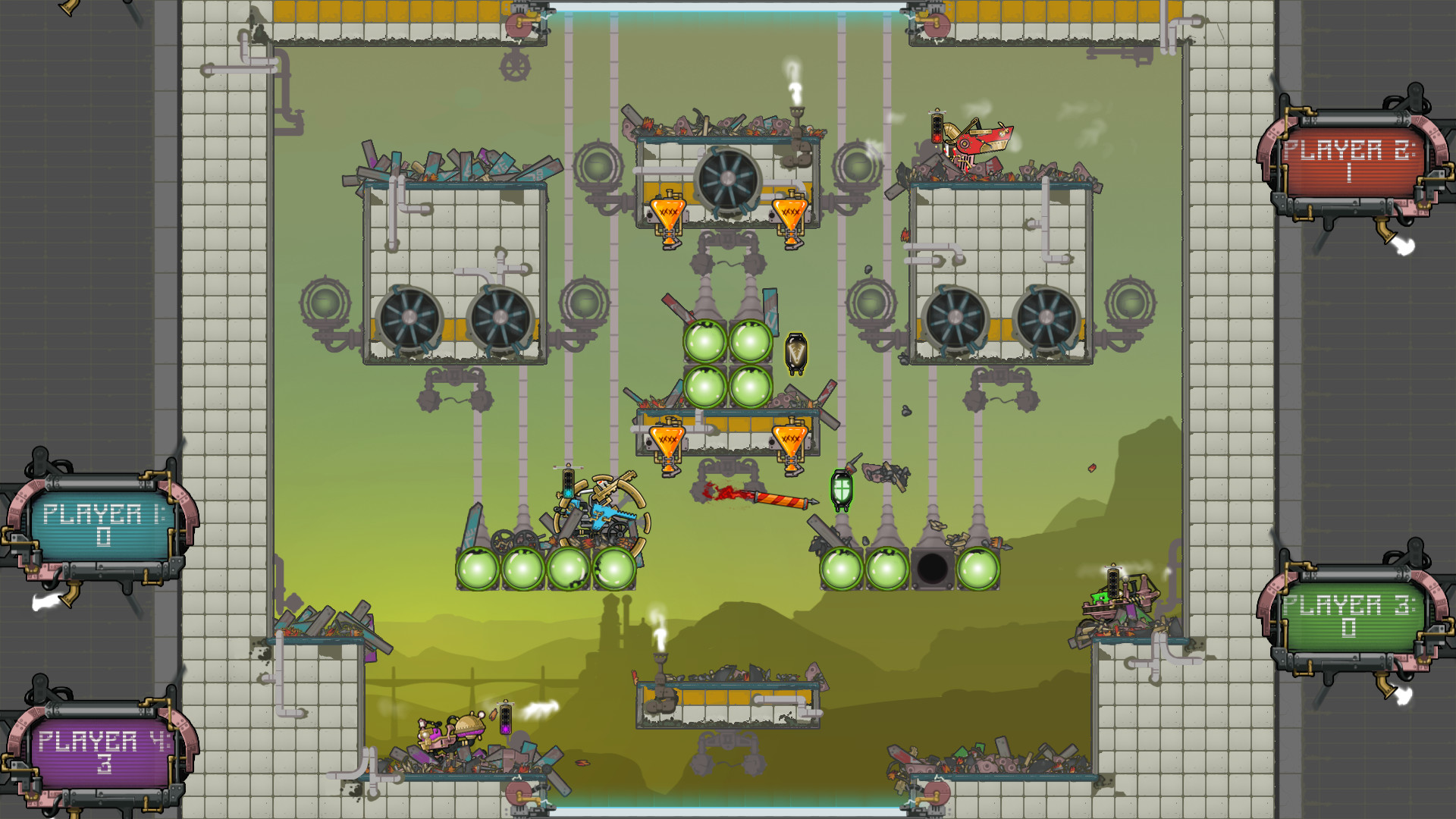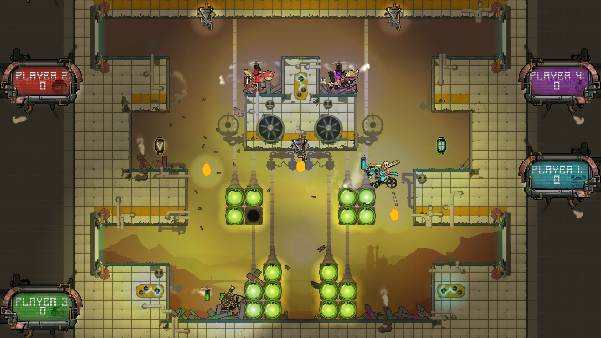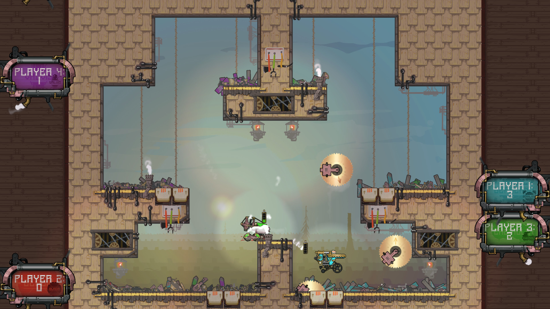 Experience the home arenas of Valvis, Gearland, Chemelot and Bladia. Each expertly booby-trapped by expert steam-bot arena designers. Valvis: light festival lanterns that drop beneath your feet, explosive lanterns and confetti canons. Gearland: the industrial metal works factory with swinging smelter bowls, switching molten molds and dimming lights. Chemelot: the volatile and dangerous hazard, lab threatening, spitting acid vials, sticky sludge and slippery yet destructible glass chemical balls. And Bladia: a dangerous sawmill full of jump pads, flying wooden platforms and moving sawblades. Fittingly enough, its special weapon pick-up is a flying buzzsaw!