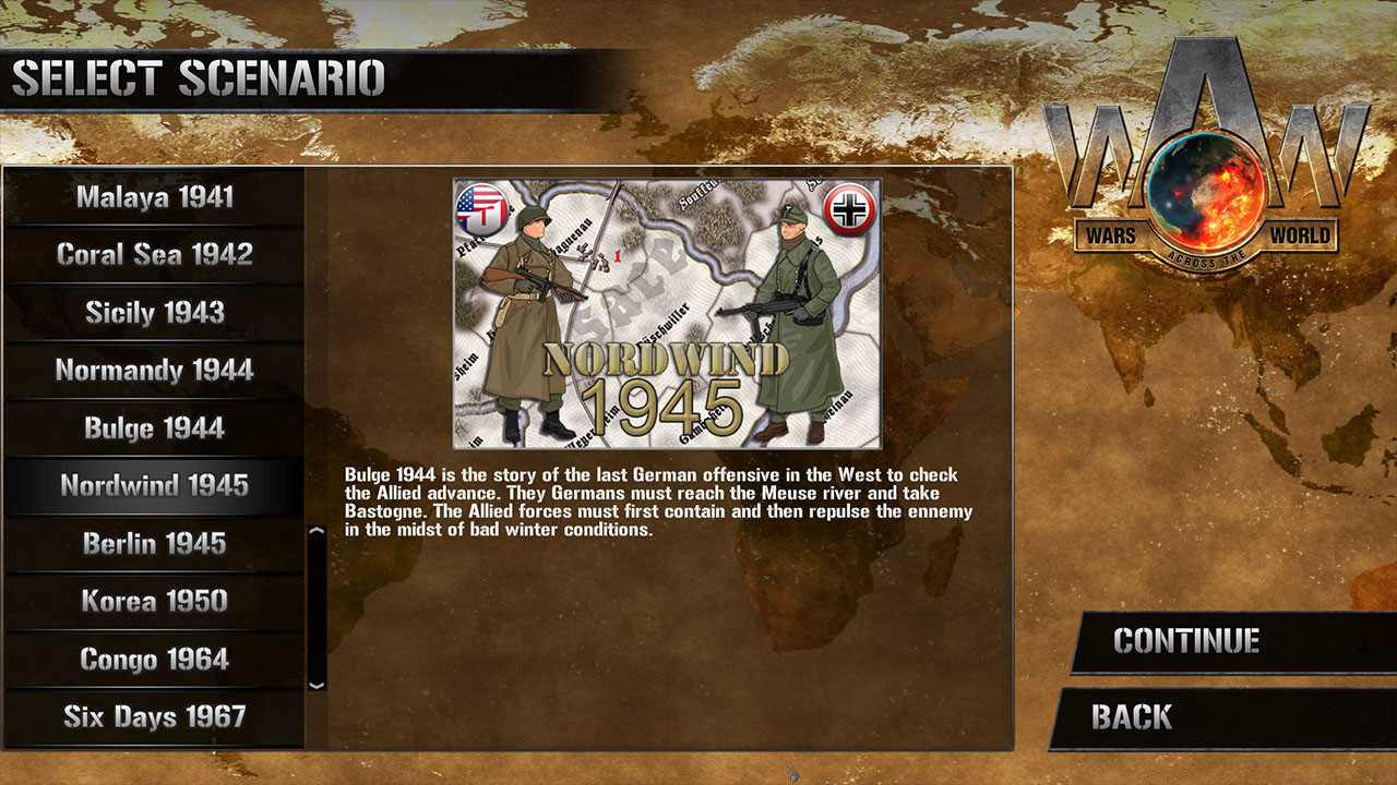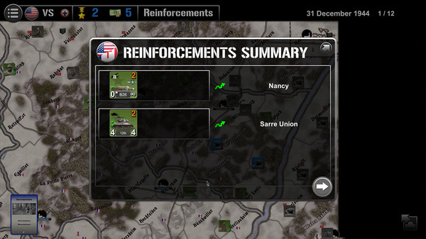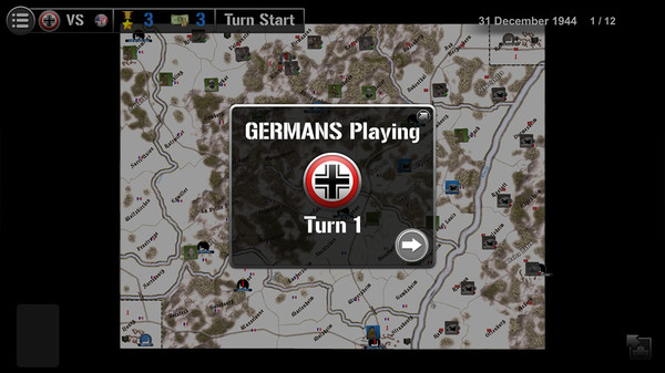 Nordwind 1945 lasts 12 turns, each representing 2 days, between the 31st December 1944 and the 26 January 1945. One player controls the German forces of the Wehrmacht and SS, the other the Allied forces from the United States and France.