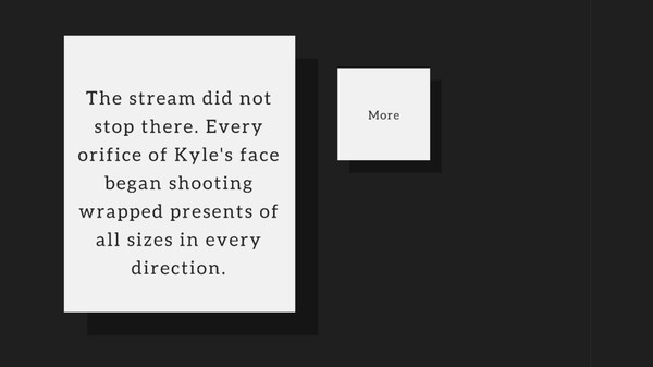 Kyle has been gifted a Christmas miracle in bed and is now Santa. You must help him on his Santa-ly duties to spread cheer and merriment to all those around him. New options are exposed in the world for Kyle when he is Santa, lending you some extra tidbits of dialog with the old characters.