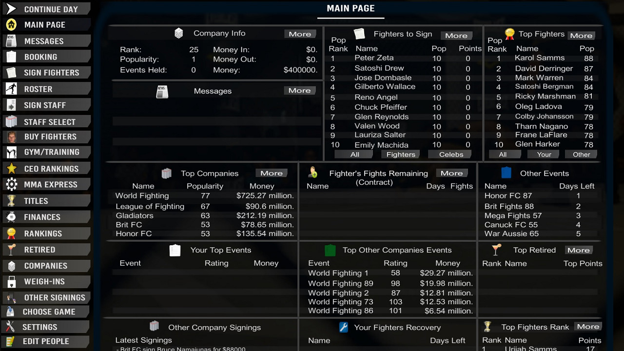 - Sign and buy fighters. Buying fighters is more expensive than signing free agents but is a fun feature when your company starts making money.