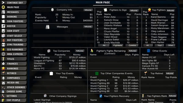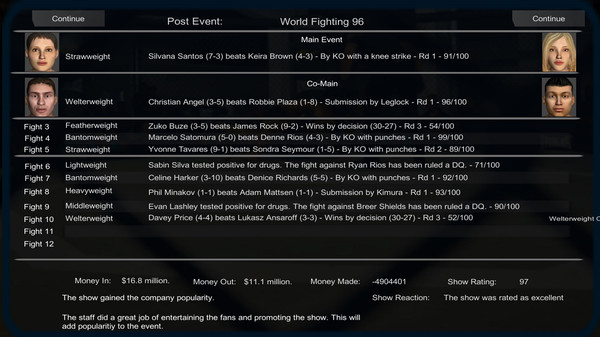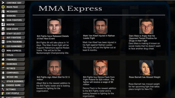 - CEO (You)/ Fighter relationships. Keep your best fighters winning or they might want to sign with another company. Also fighters are not too pleased when facing fighters on performance enhancing drugs or those that can't make weight.