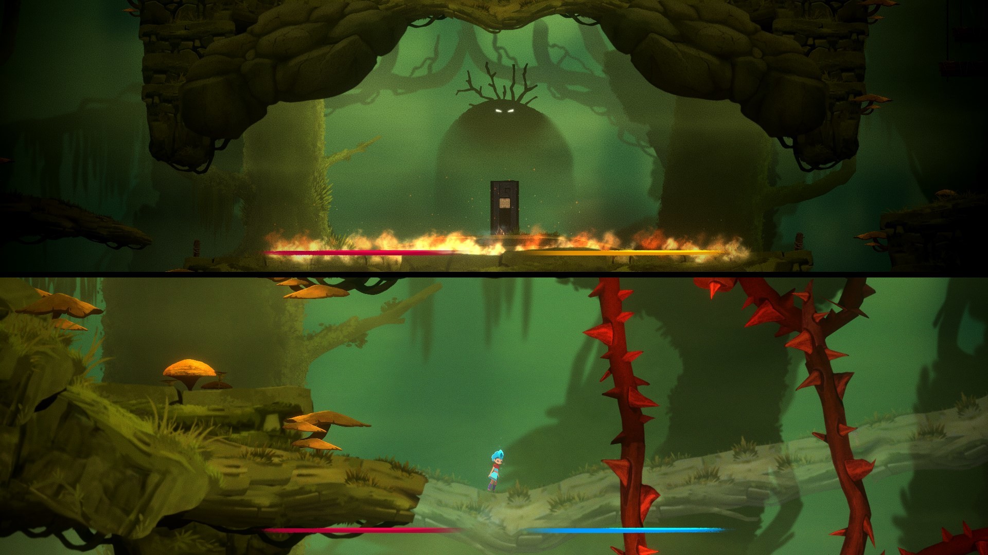 Die Charaktere befinden sich in ihrem Bereich eines Levels an einem gemeinsamen Ort. Die Bereiche des Levels sind jedoch miteinander verbunden. Die Charaktere interagieren und helfen sich gegenseitig, das Level abzuschlie?en. Sie k?nnen Schl?ssel und Gegenst?nde von einer H?lfte des Bildschirms zur anderen bewegen und auch die meisten R?tsel werden von den Charakteren gemeinsam auf einem kombinierten Bildschirm gel?st.