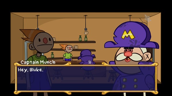 The Isle of Flungo is open to explore, whether it be on foot, or by (extremely run-down) vehicle. As Bluke, you'll navigate varying locations in a side-scrolling, point-n-click perspective, able to click on any object or character of interest to engage with it. Then, hop into the Munchmobile to take a road trip throughout the overworld - featuring optional objectives, a shop, and plenty of weird interactions!