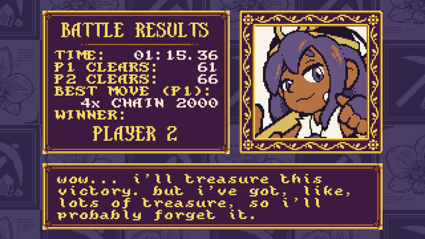 Challenge the Story Mode to take your chosen character through their tale, challenging all the others in fierce puzzle battles to assemble all seven Sacred Blossoms! Shoot for high scores in Solo Play, racing the clock or rationing limited moves to get the highest rank you can! Solve puzzling brain-teasers with limited moves in the Puzzle Mode, and make your own puzzles to share with friends! Challenge another player or fight the CPU in Versus Mode, racing to make clears and bury your opponent!