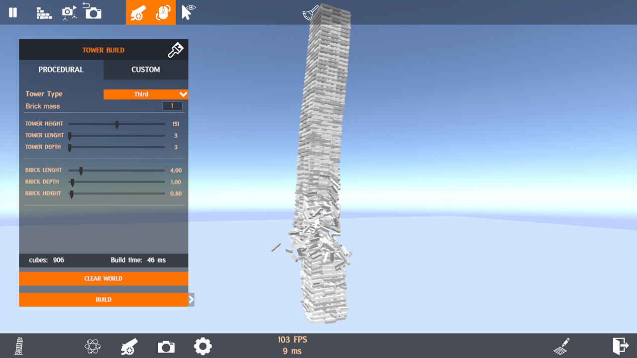 Game allows you to build many kinds of towers from a variety of bricks and experience their dynamic destruction physics in a sandbox environment.Different types of interaction.wrecking ballearthquakewindexplosionSteam workshop supportBuild or improve on existing tower . You can then import them into the game, share them on the Steam workshop.