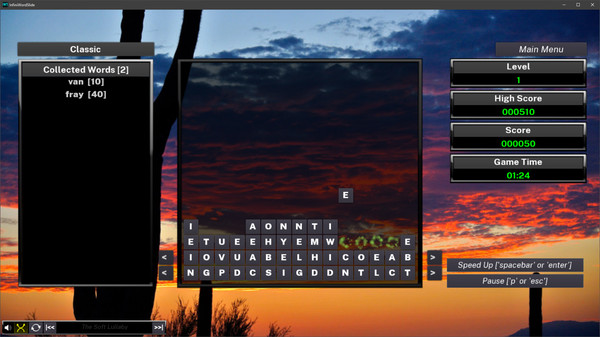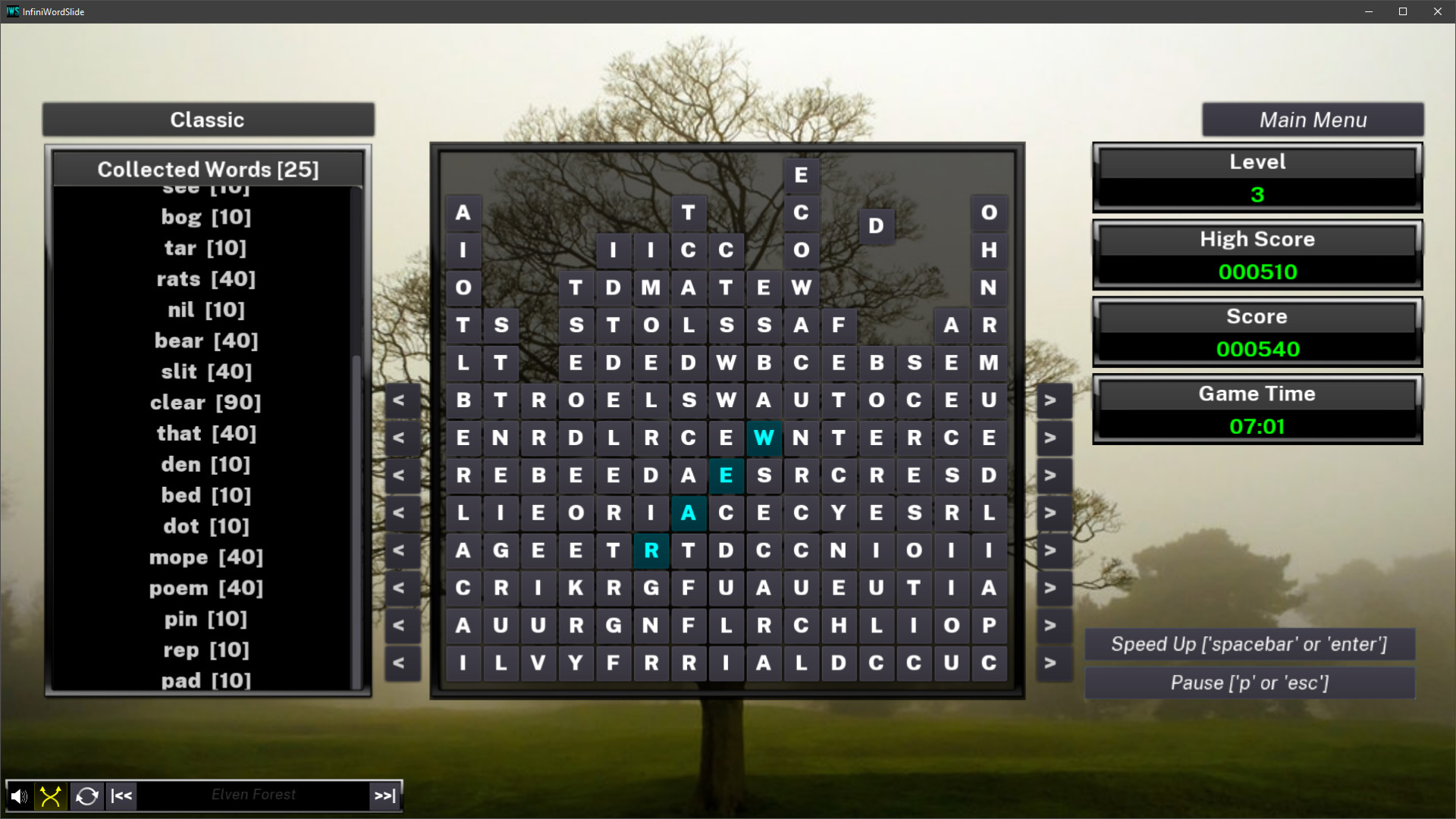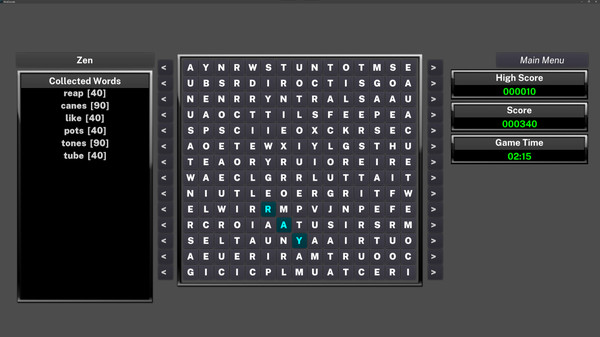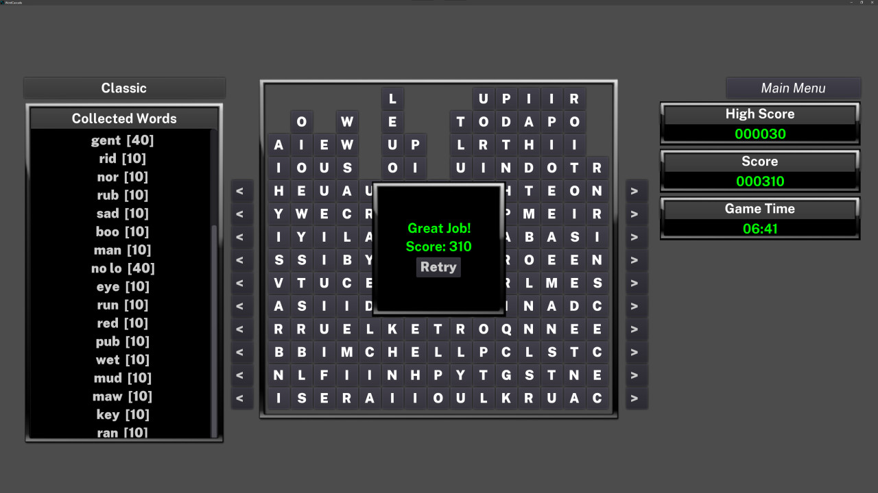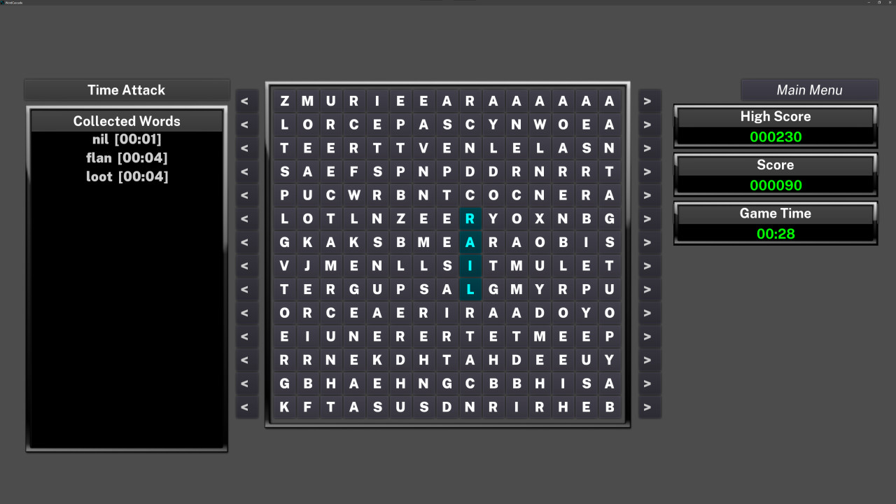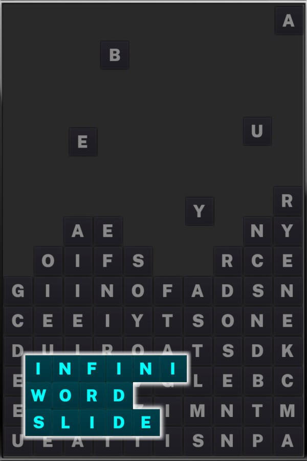 Midway between the word search and the *tris games, this game challenges your mastery of the language, your ability to strategize, your reaction time and your attention to detail. In the Classic mode, you must race the clock to find words on the grid and prevent the ever falling letters from reaching the top of the screen. Filled rows will let you slide sideways, a real key to staying alive! In contrast, the Zen mode gives you an eternally filled grid where your only goal is to find as many words as you want, at your leisure. If you'd rather play with a full grid, yet keep the pressure on, the Time Attack mode might be what you're looking for. Finally, the Escalation mode will reward your ability at making long words, for queuing small ones will mark the end of the game. Infinite gameplay, no real upper score, simple controls and clear mechanics makes this a fun arcade game without any cheap continues. More to come very, very soon.