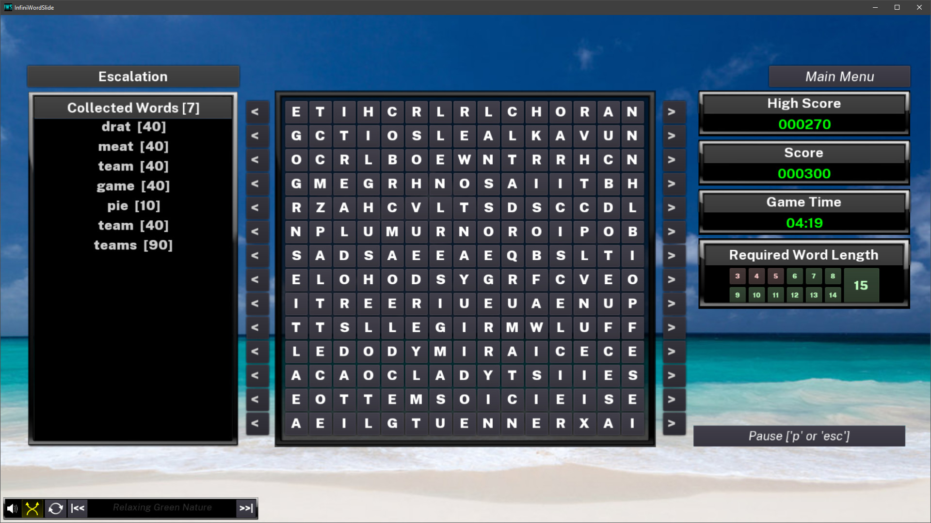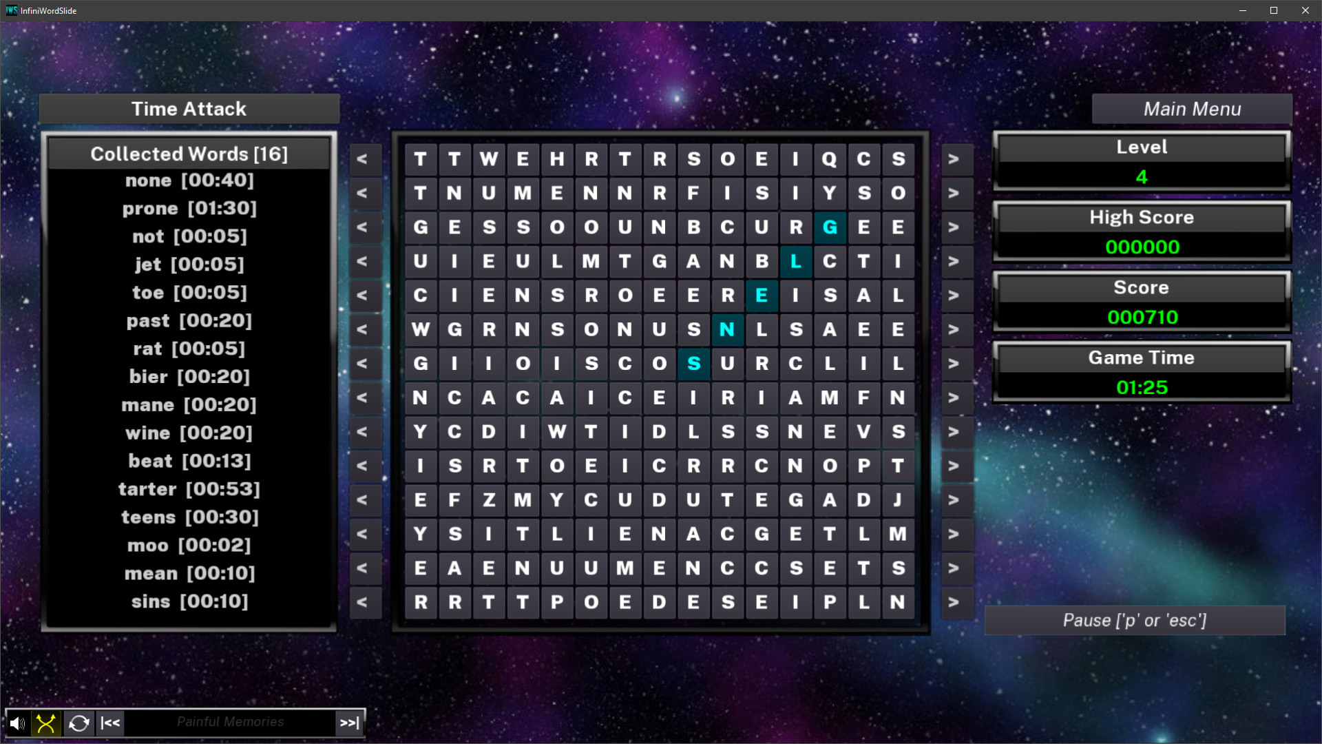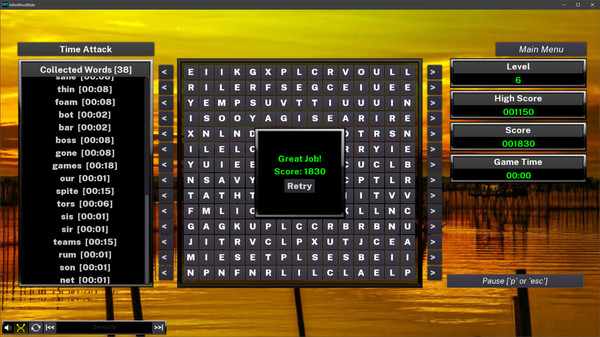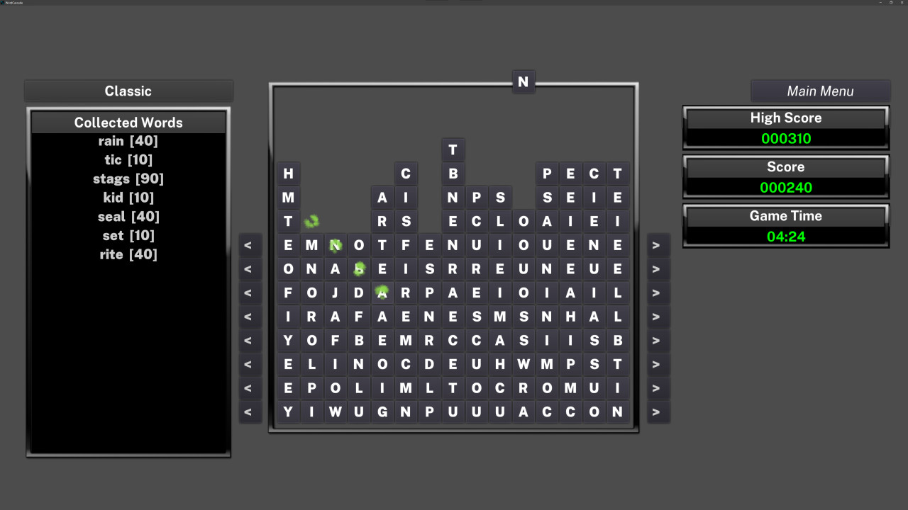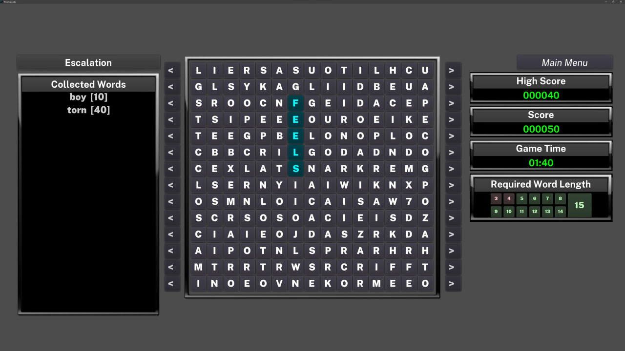 Midway between the word search and the *tris games, this game challenges your mastery of the language, your ability to strategize, your reaction time and your attention to detail. In the Classic mode, you must race the clock to find words on the grid and prevent the ever falling letters from reaching the top of the screen. Filled rows will let you slide sideways, a real key to staying alive! In contrast, the Zen mode gives you an eternally filled grid where your only goal is to find as many words as you want, at your leisure. If you'd rather play with a full grid, yet keep the pressure on, the Time Attack mode might be what you're looking for. Finally, the Escalation mode will reward your ability at making long words, for queuing small ones will mark the end of the game. Infinite gameplay, no real upper score, simple controls and clear mechanics makes this a fun arcade game without any cheap continues. More to come very, very soon.