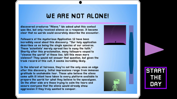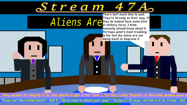 Become a news pundit for the popular news stream show, STREAM 47A. You and two others, Clark and Patricia, are tasked with commenting on the latest news story that's shaken the entire planet to its core. Aliens exist, and thus we are not the only intelligent life in the universe. One thinks this marks a new age for humanity, and the other believes this is the beginning of the end. But how do you take this revelation? Are you happy? Scared? Something in between? The whole world is watching you and hanging on to every word you say. The people's perception of the newly discovered aliens will be shaped by your opinions. Not only that, but the aliens themselves will almost certainly hear what you have to say. What kind of first impression do you want to leave?