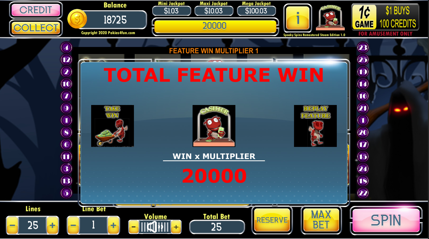 Free spins cannot be retriggered during free spins. Re-spin or Take Win Feature may be selected after free spins.