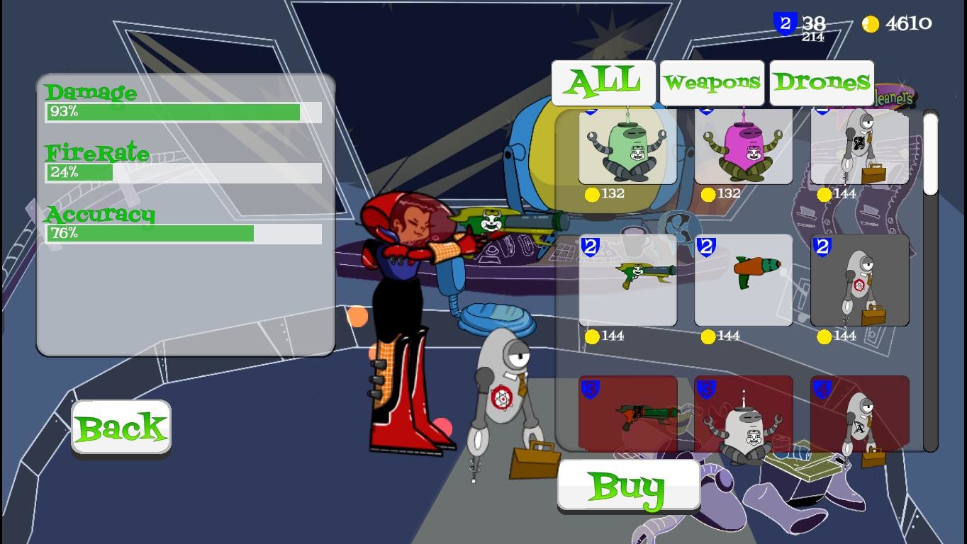 Buy from an unlimited source of randomly generated weapons and killer robots to aid you in your dangerous job.