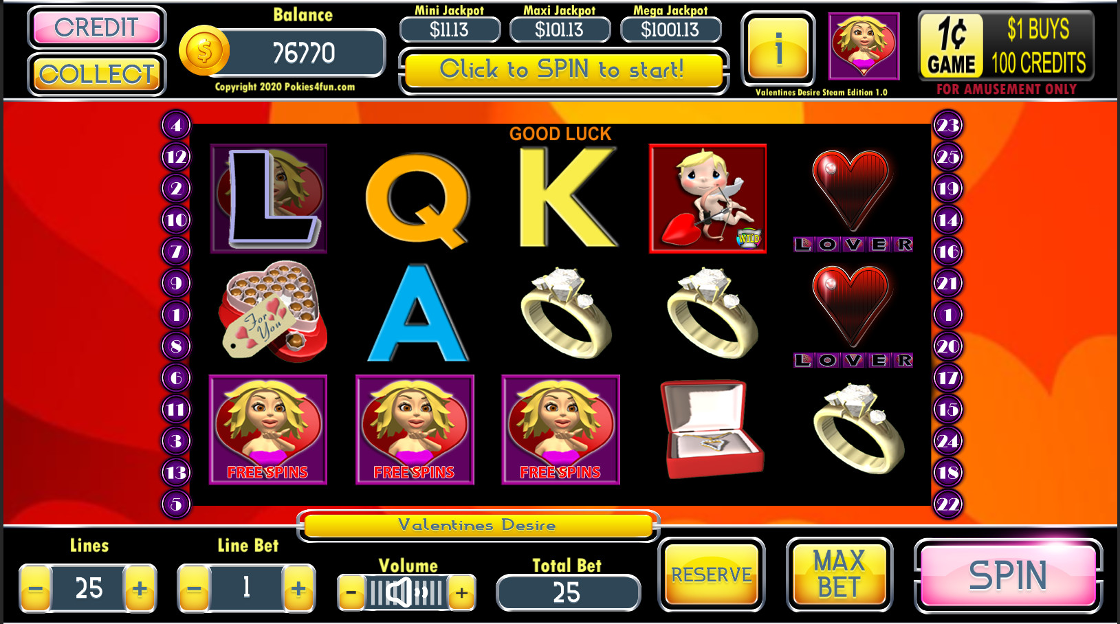 During free games any (6) six or more Hearts Cash values on screen trigger the Hearts Cash Feature.