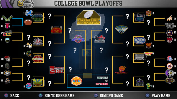 COLLEGE BOWL is a beautifully pixelated on-field simulation experience that brings you into the world of colleges across the nation. Challenge college rivals on your way to winning a National title! Take on various game modes, including a deep Dynasty where you try to improve your school's prestige levels, all while trying to keep your coaching job along the way! Manage campus facilities, hotheaded young players, new recruits, mascots, and so much more!