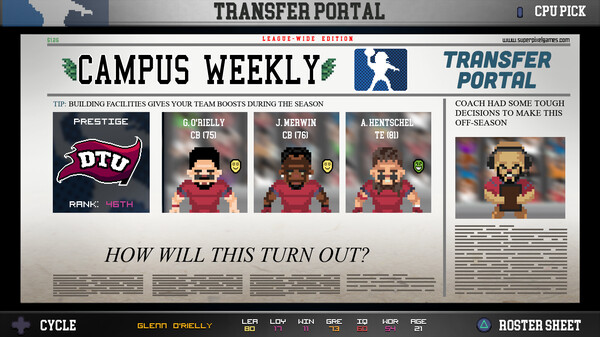 Dive into the world of College football where the path to success is anyone's game! College Bowl allows you to build your program into a powerhouse where you'll be met with coaching goals, disciplinary decisions, transfer portal, and scouting & recruiting challenges along the way!CREATE YOUR TEAM