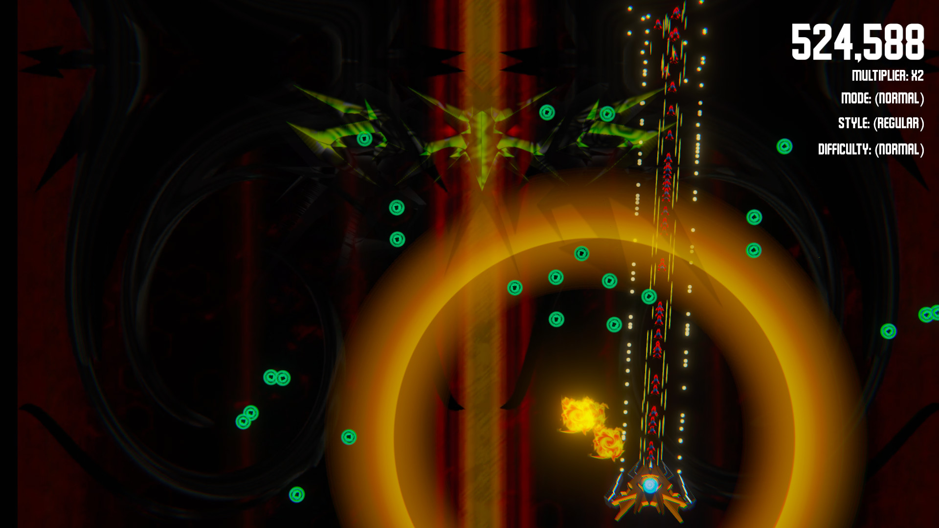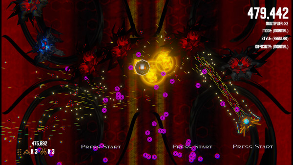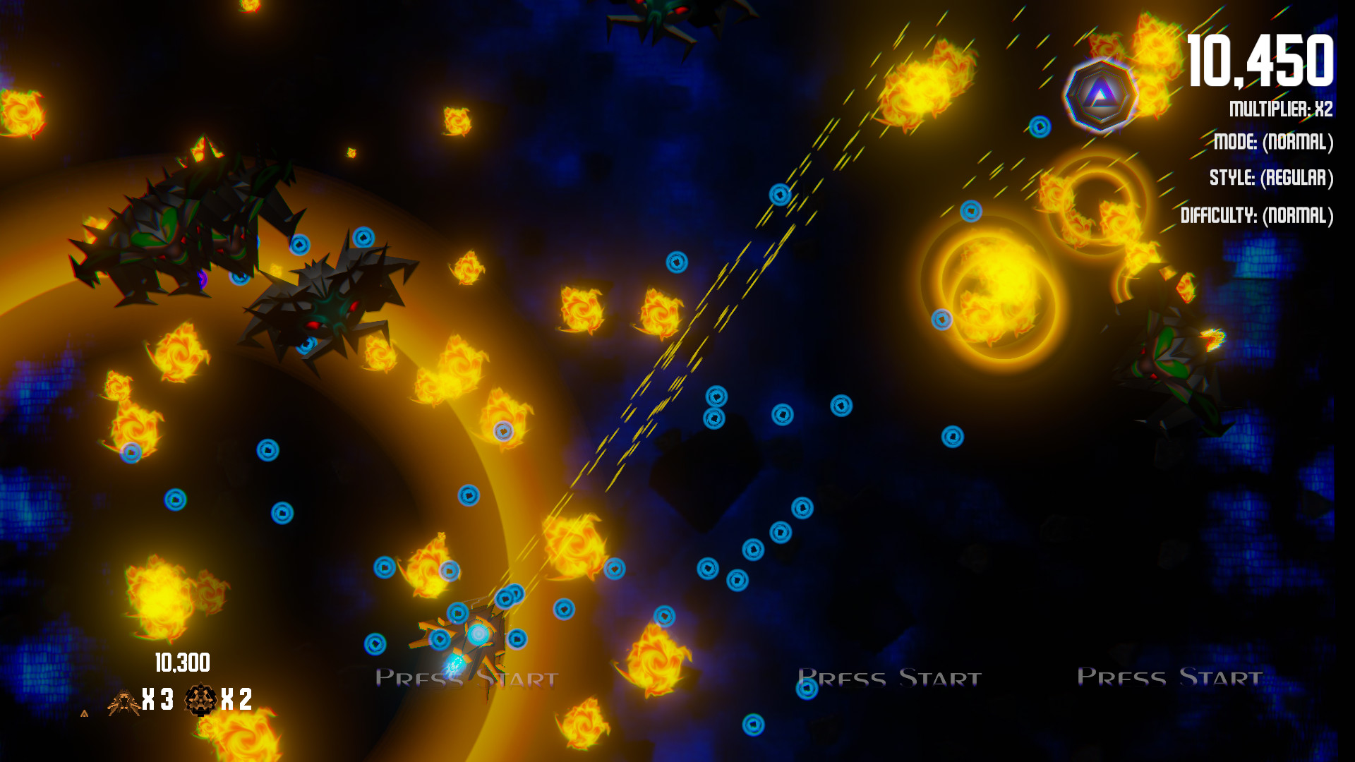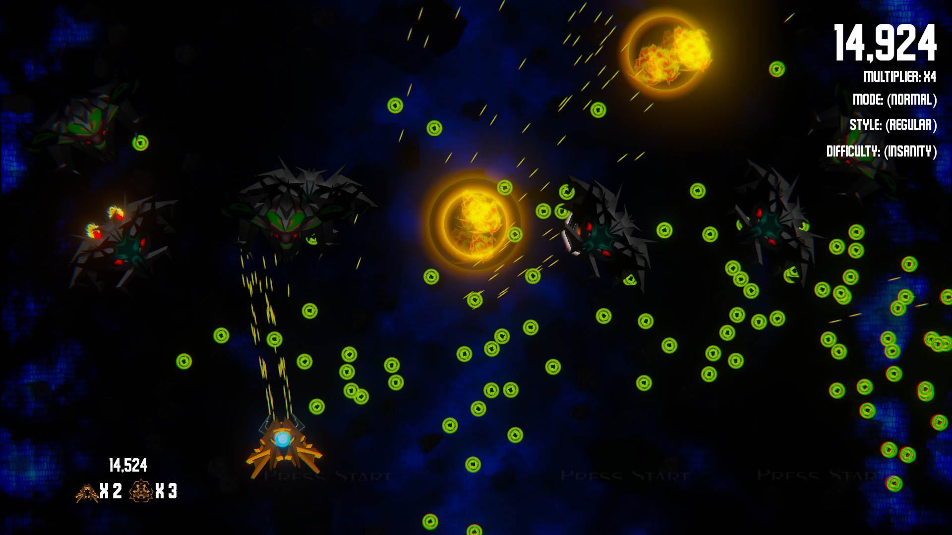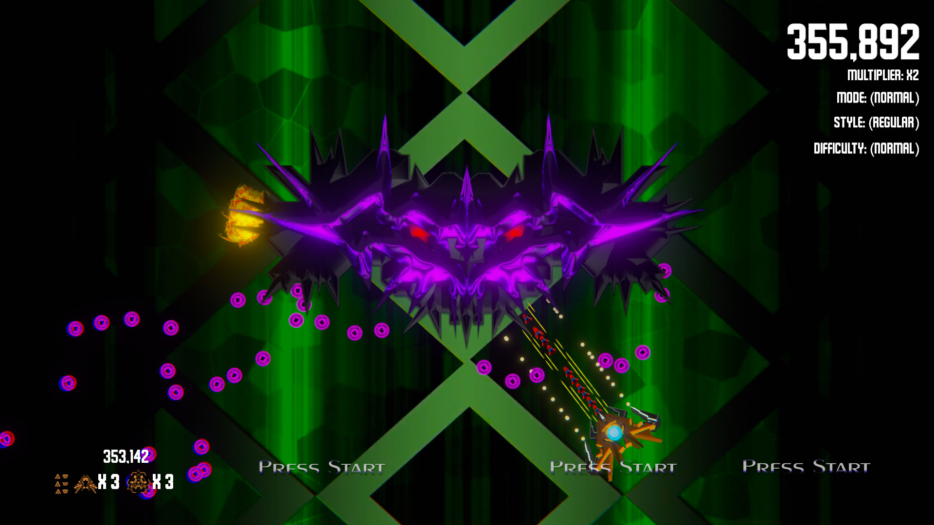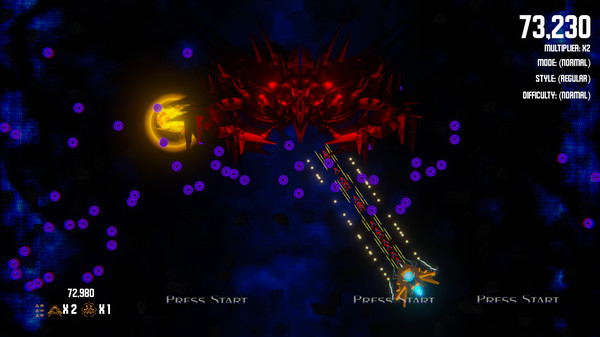 - Normal - Start with 3 lives, 3 bombs and no upgrades. (Each upgrade type is reduced by 1 on death)