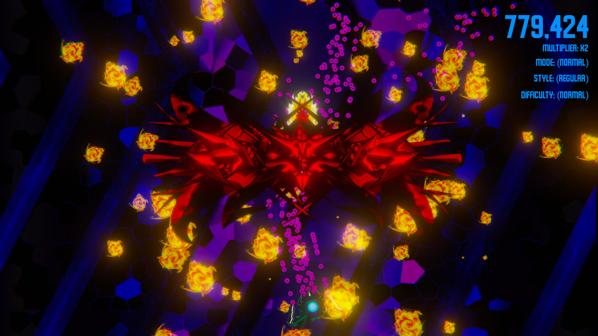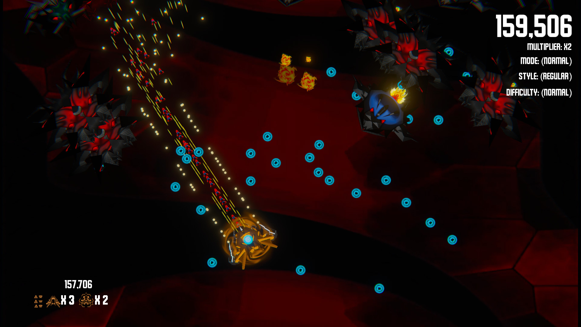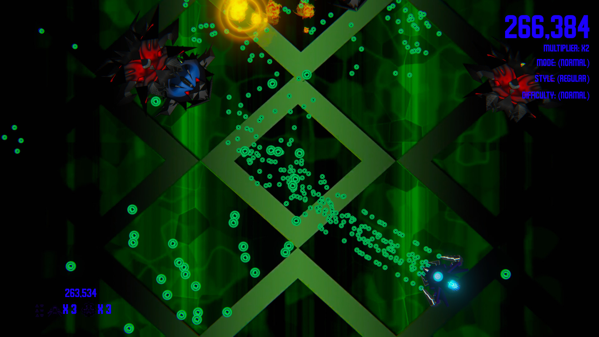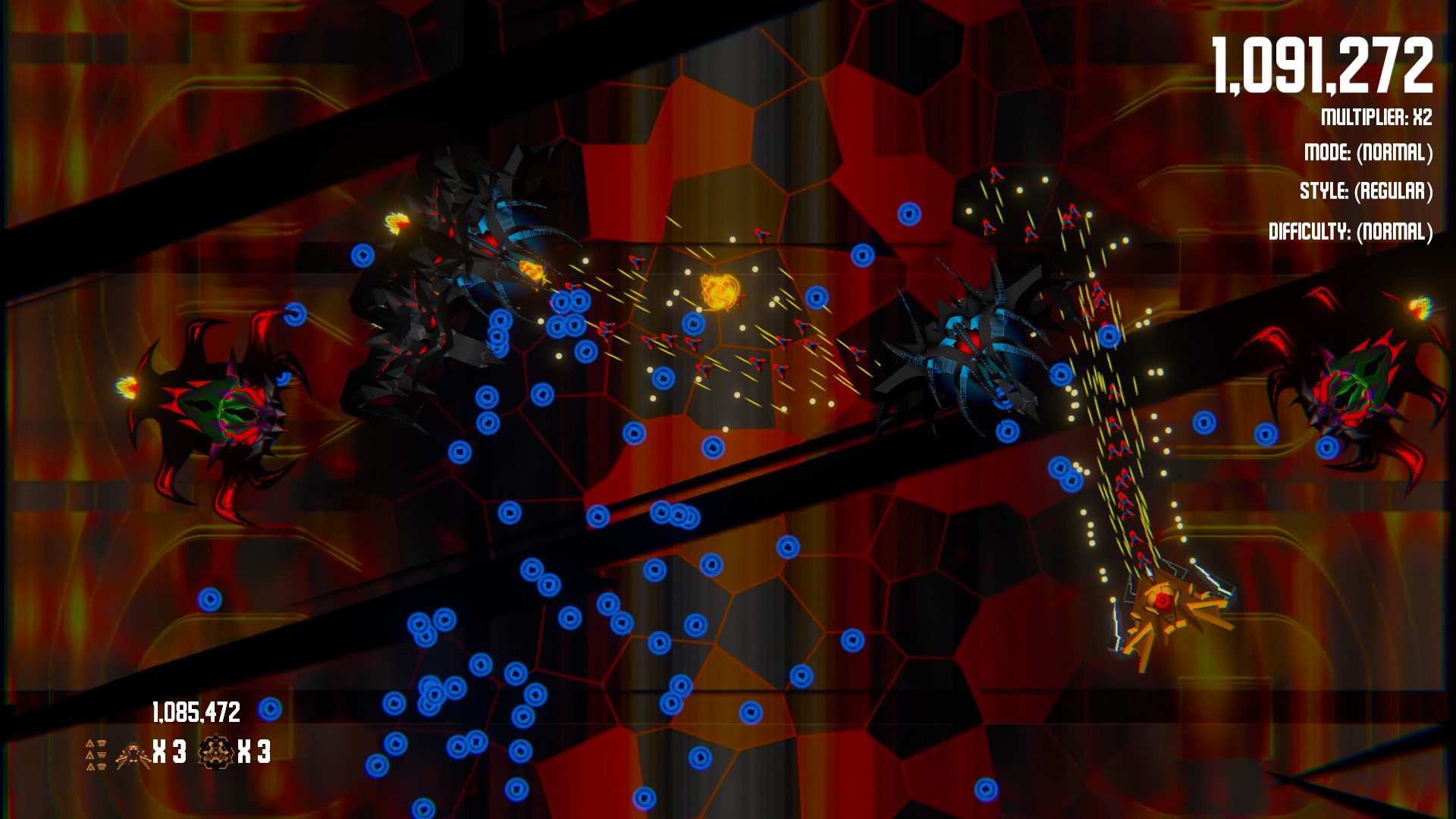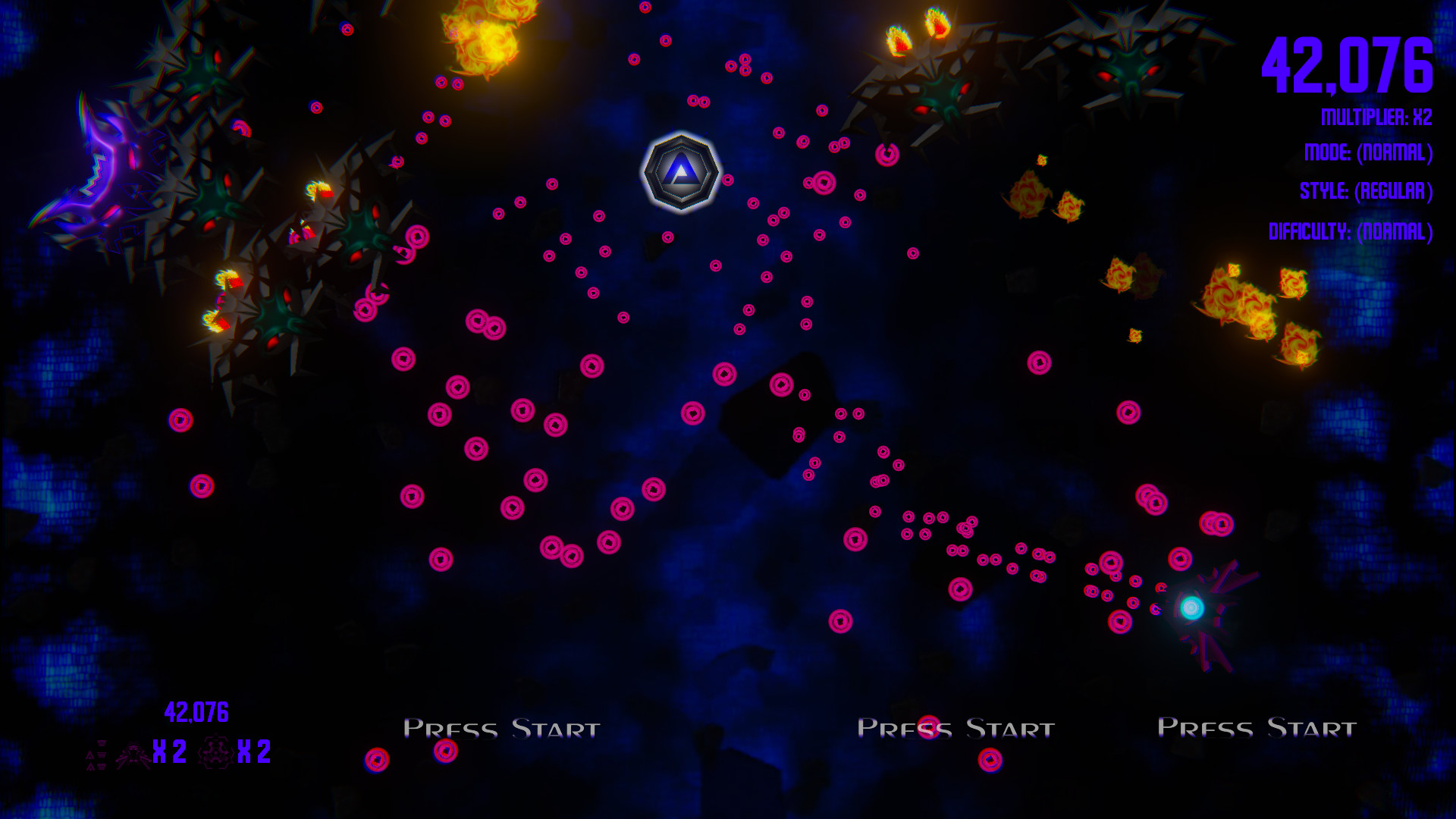- Normal - Start with 3 lives, 3 bombs and no upgrades. (Each upgrade type is reduced by 1 on death)