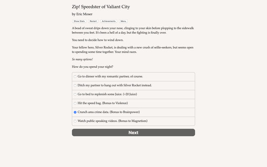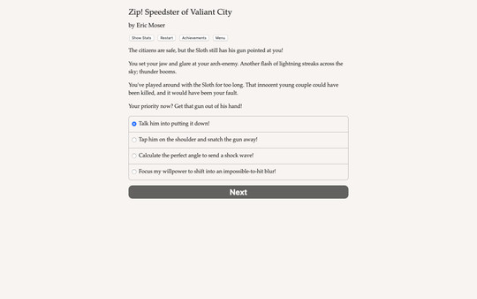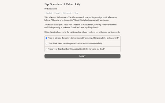 Zip! Speedster of Valiant City is a 48,000-word superpowered interactive novel by Eric Moser. It?s entirely text-based, without graphics or sound effects, and fueled by the vast, unstoppable power of your imagination.