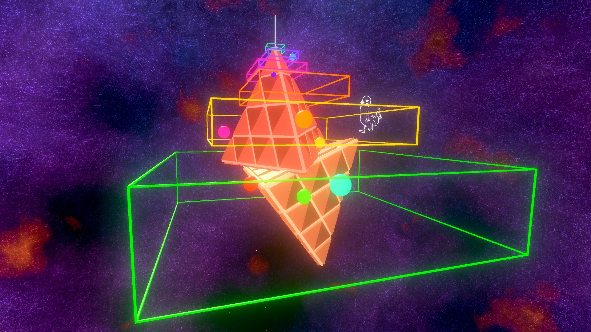 Each shape and color emits a different sound, which will sync with the background song that the player chooses. Having no rules allows you to do whatever you want to. Fly around spawning shapes or create a tree in the colors of a rainbow.