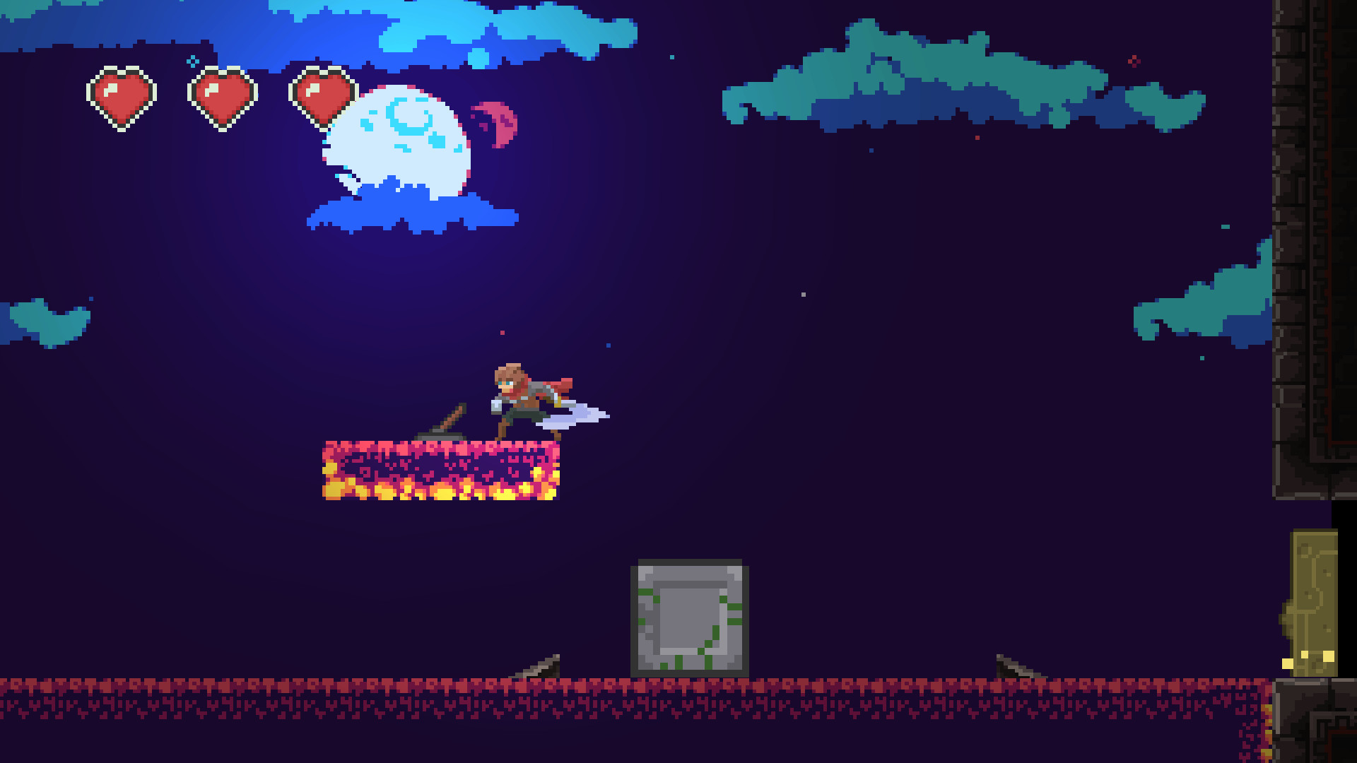 - Using the down-attack, you can hit the enemy to the ground and cause a certain range of damage. You can also damage specific objects in the maze.