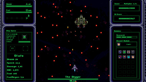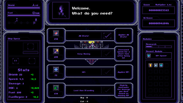 The Research System will allow you to further power up your ship before each playthrough. Research points are obtained through picking up Modules of any kind and may be spent on any of the 3 available Research Trees: Offense, Defense and Utility.