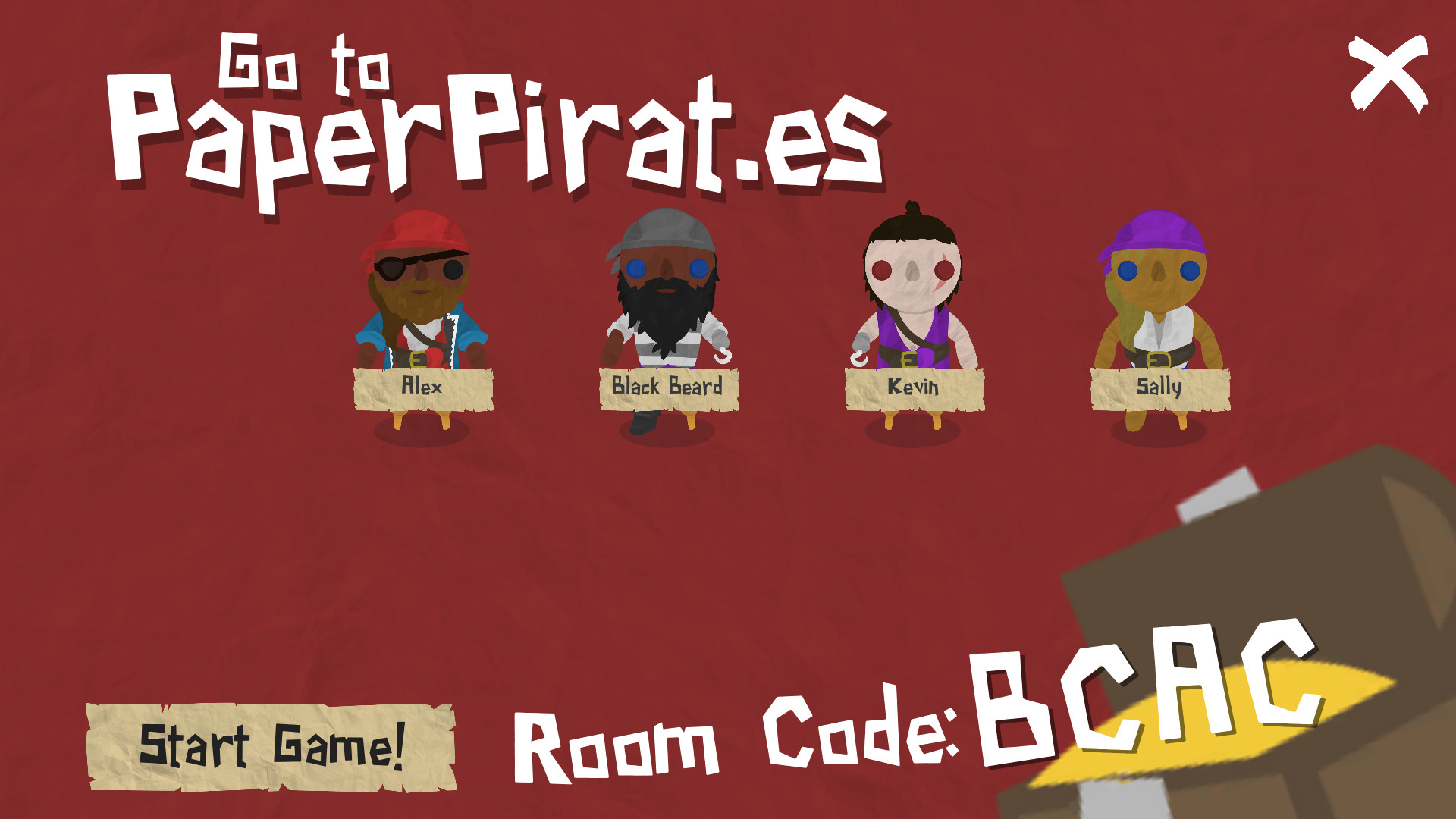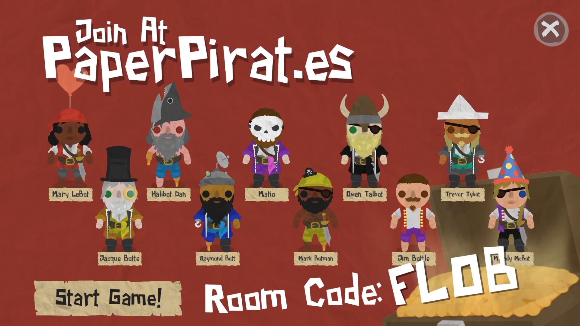 If you own Paper Pirates, you can create a lobby and any of your friends can join even if they don?t own the game! Share the room code and they can join from a web browser on their own PC, laptop, mobile phone or tablet. Play locally, or use Steam Remote Play Together or any other screen sharing solution to play with friends further away!