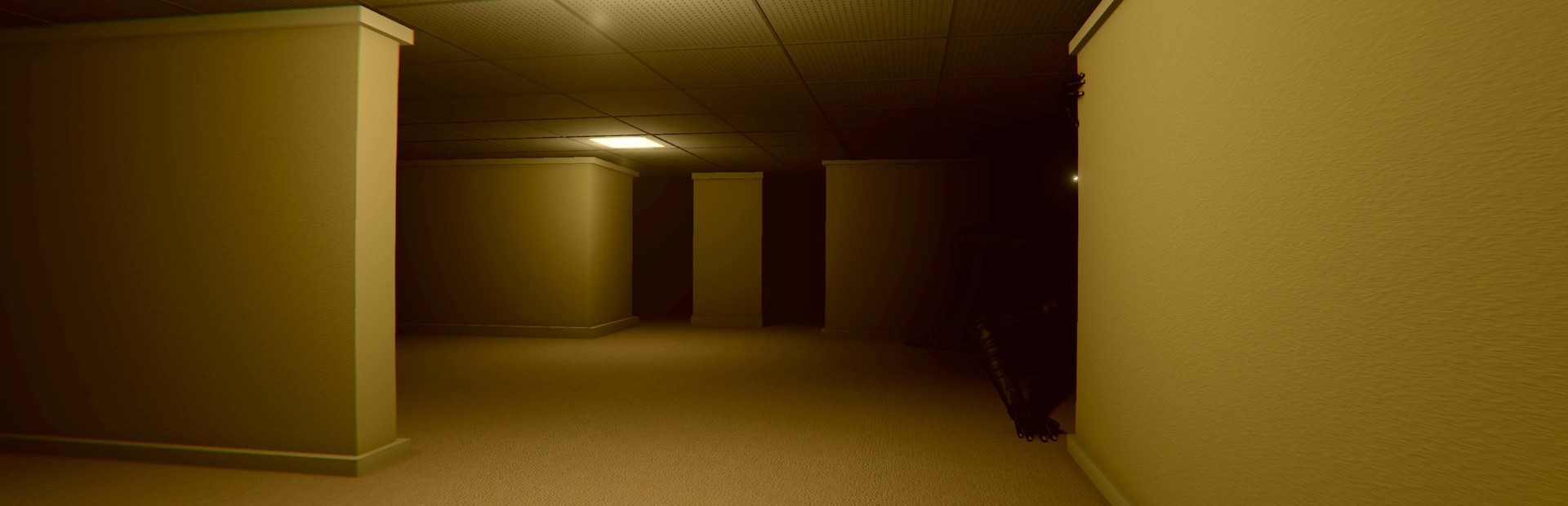 Wenn Sie nicht aufpassen und in den falschen Bereichen nicht aus der Realit?t herausspringen, landen Sie in den Hinterzimmern, wo es nichts als den Gestank alter, feuchter Teppiche, den Wahnsinn von Mono-Gelb, das endlose Hintergrundrauschen von Neonlichtern gibt bei maximalem Brummen und ungef?hr 600 Millionen Quadratmeilen willk?rlich unterteilter leerer R?ume, in denen man gefangen sein kann. Gott sch?tze Sie, wenn Sie etwas in der N?he herumlaufen h?ren, denn es hat Sie verdammt noch mal geh?rt.