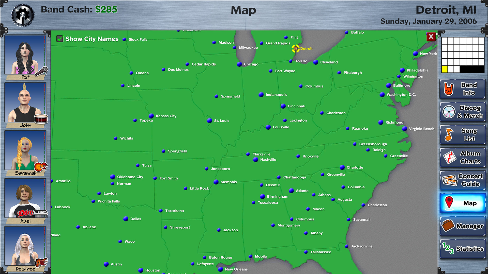 Choose your starting city in the continental United States, and conquer as many cities as you can while on tour. You can even buy a home in each city, to make visits more convenient than staying in a hotel or motel. Of course, trashing hotels is half the fun of touring, but you?ll have to pick up the tab.