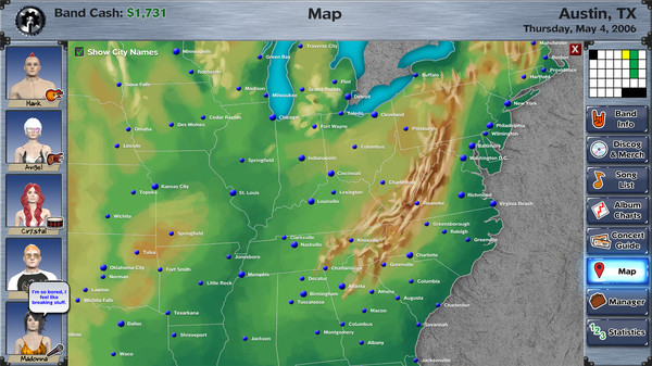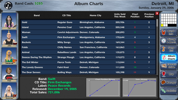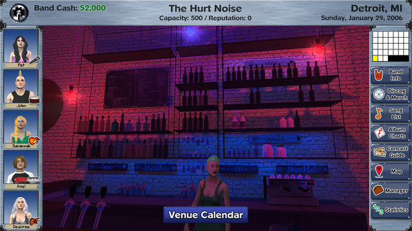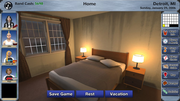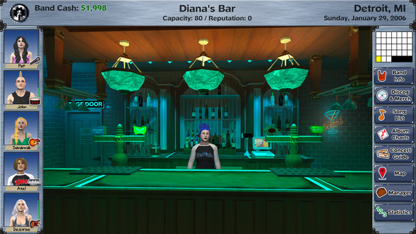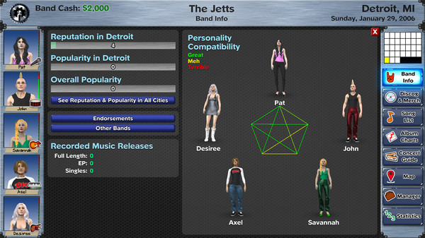 Recruit compatible musicians, balance relationships, earn a reputation and become popular amongst the local scene. Making valuable use of concert guides, choosing the right gig, writing the perfect song, and securing close ties to other bands is all part of the journey to stardom.